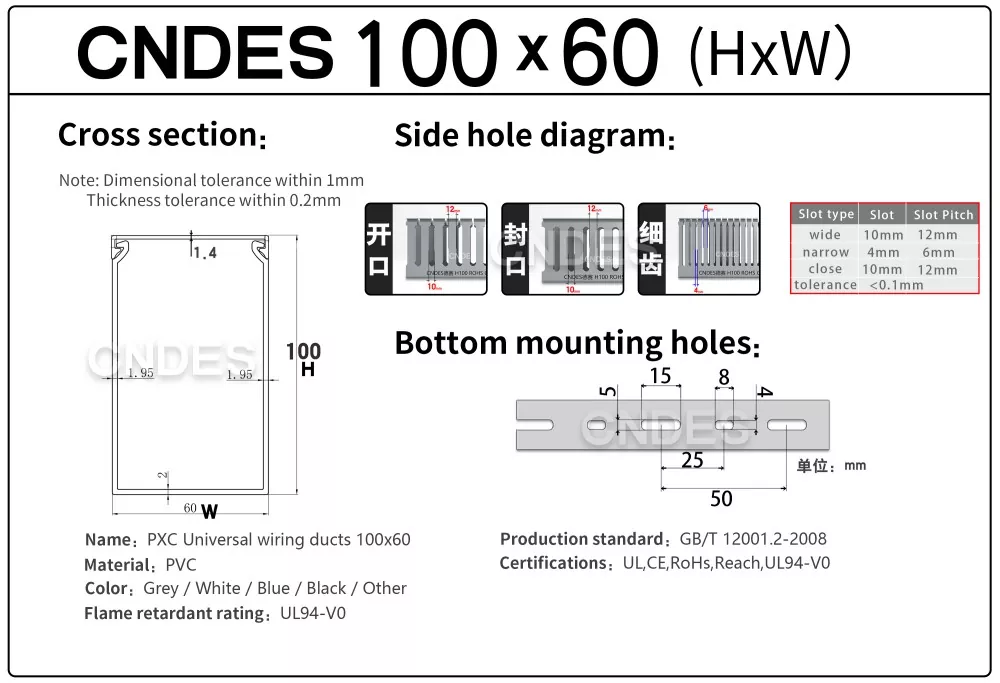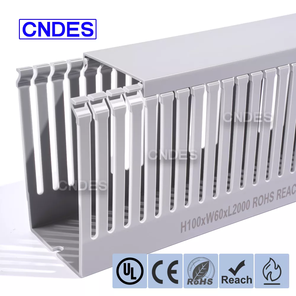 精密スロット - 精密溝加工 - 電気パネル用の高品質 100×60 PVC ダクトは、均一な溝設計を特徴としており、ケーブルをどの位置からでもきれいに取り出すことができます。カスタムの穴パターンもオプションでご利用いただけます。