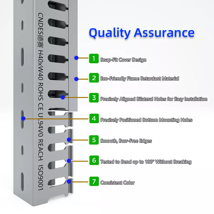 CNDES のカスタマイズされた 40×25 PVC 配線設置ダクトは、コンパクトな電気パネル、小型制御キャビネット、産業用エンクロージャ用に設計されています。スリムな 40 × 25 mm のプロファイルにより、狭いスペースでもケーブルをきちんと整理でき、電源、信号、データ ラインをきれいに分離しながら、アクセシビリティと安全性を向上させます。