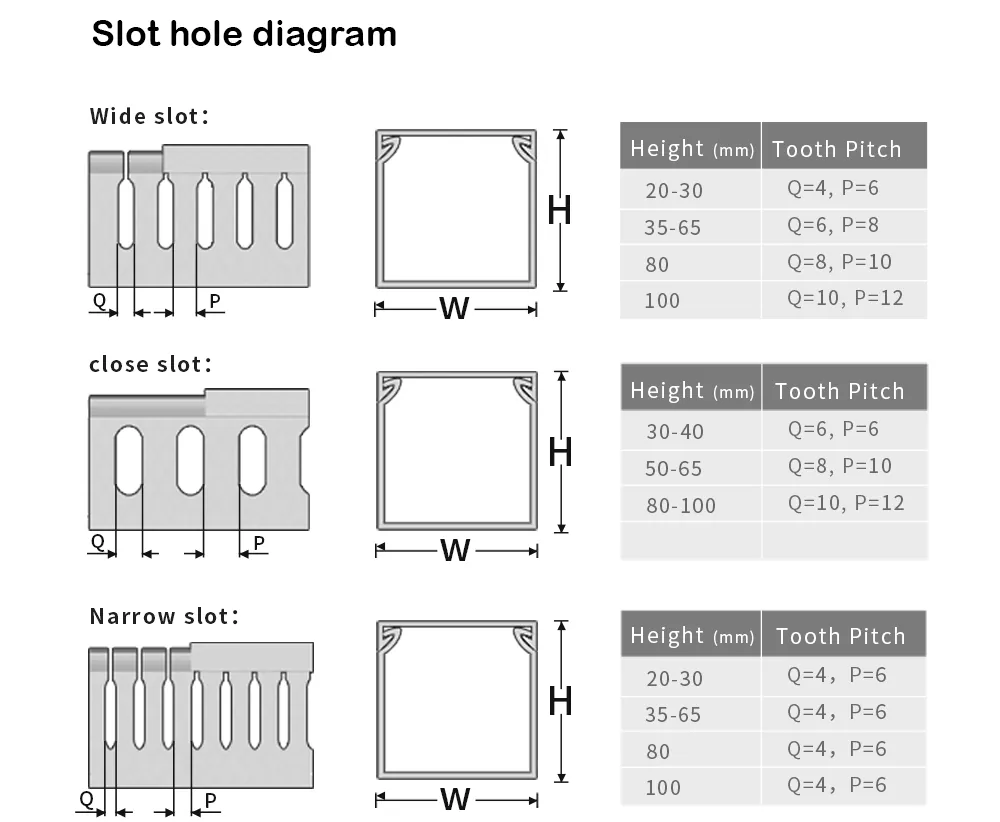 ケーブルトレイの仕様は高さ×幅で表され、単位はmmです。まず、ケーブル トレイの必要なサイズ (高さ 80 mm、幅 40 mm など) を決定します。そして配線の太さに合わせてコンセント穴幅を太歯(8mm)か細歯(4mm)からお選びください。実際のケーブルがトレイのスペースの 70% を超えないようにすることをお勧めします。
